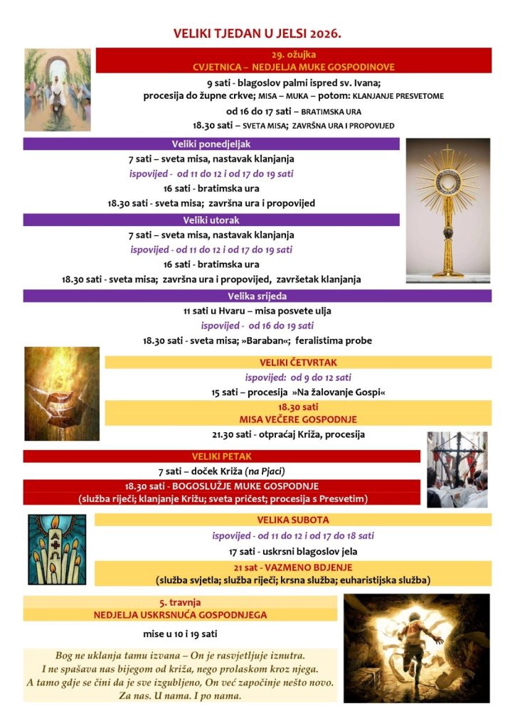 Galerija slika Breadcrumb NaslovnicaDogađaji Raspored bogoslužja u Velikom tjednu – Jelsa U nastavku donosimo raspored bogoslužja tijekom Velikog tjedna u Jelsi – razdoblja ispunjenog posebnom duhovnošću, bogatom tradicijom i jedinstvenim doživljajem otoka. Pozivamo vas da nam se pridružite i postanete dio ovih nezaboravnih trenutaka. Detalji događaja 29.03.2026. – 05.04.2026. 07:00 Za sve dodatne informacije kontaktirajte nas na Trg Tome Gamulina 1, 21465 Jelsa +385(0) 21 761 017 +385(0) 21 761 017 info@tzjelsa.hr